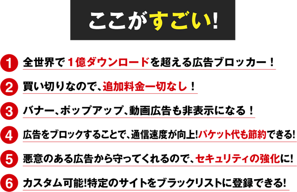 広告バナーやポップアップ、 動画広告も非表示に!