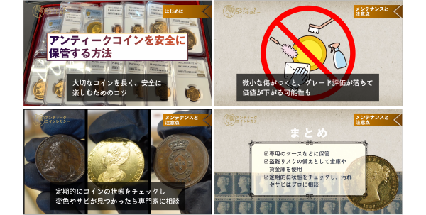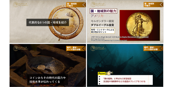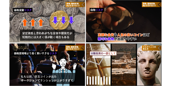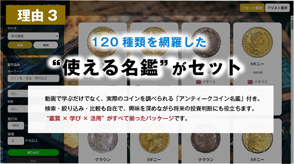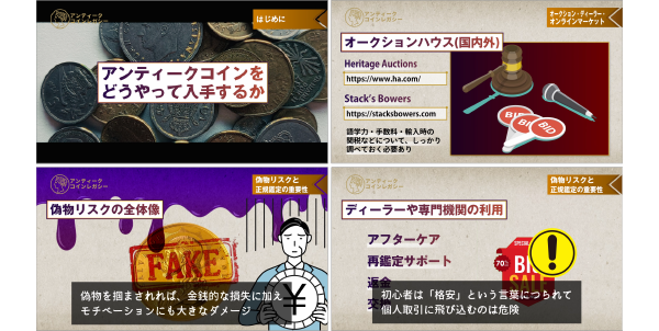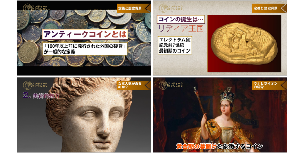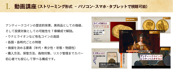 A. はい、ご安心ください。本講座は「アンティークコインって何?」という方でも理解できるよう、 歴史・美術・投資の基礎から丁寧に解説しています。専門用語もナレーション付きでわかりやすく進行します。