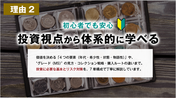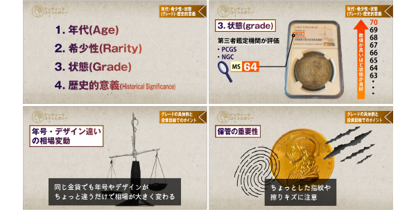 「年代」「希少性」「状態」「歴史的意義」の4軸で、“なぜこのコインが高額なのか”が具体的に理解できるようになります。