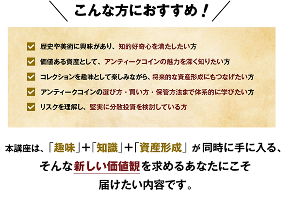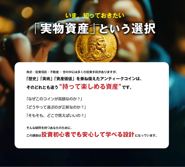 A. はい、全く問題ありません。アンティークコインは「難しい投資」というよりも、“知れば知るほど面白くなる文化資産”です。 本講座では「なぜ価値が落ちにくいのか」「どんな視点で選べばいいのか」まで、初心者の方にもわかるよう丁寧に解説しています。