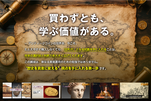 A. アンティークコインは“流行ではなく歴史”に根ざした資産です。だからこそ、一度学んだ知識は長く役立ちます。 また、本講座では時代を超えて評価されてきた普遍的な価値基準を扱っていますので、古くなる心配はほとんどありません。