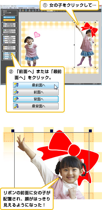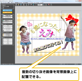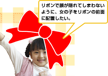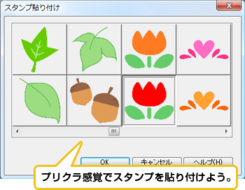 スタンプの使いかたは、楽しいマークやかわいいイラストをクリックして、「OK」をクリックするだけ。お好みの場所にポンっと配置しましょう。プリクラ気分で合成画像を飾ることができます。