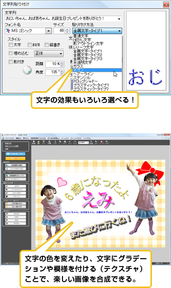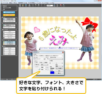テキストは好みの文字を入力して、フォントや色、サイズを指定します。文字には、影を付けたり、文字間を設定したりと細かい設定が可能です。