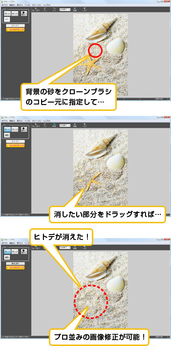 背景となる部分をクローンブラシのコピー元に指定し、消したい部分をドラッグするだけです。画像加工に慣れていなくてもプロ並みの画像修正が可能です。 |