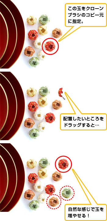| 画像内のものを増やしたいときにもクローンブラシは活躍します。増やしたい部分をクローンブラシに設定して、配置したい場所をドラッグするだけです。 |