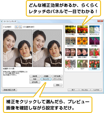 | 背景画像や切り抜き画像は補正することができ、補正内容はバラエティに富んでいます。補正を行うときに使う「らくらくレタッチ」には、補正効果が一目でわかるパネルが表示されます。パネルをクリックすることで、画像にお好みの補正を行うことができます。ワンタッチ補正や明るさ補正、逆光補正、美肌補正など、さまざまな補正・効果が揃っています。セピアやモノトーン、絵画風などの楽しい効果も見逃せません。 |