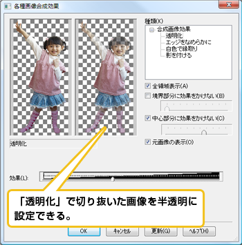 切り抜き画像を透明にする効果です。画像全体の透明度を指定できるほか、画像の中央や切り抜いた輪郭部分の透明効果の分量もそれぞれ指定することができます。 |