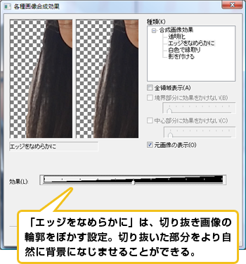 切り抜き画像の輪郭をぼかすようになめらかに見せる効果です。髪の毛やふんわりした材質のものなどを自然に見せたい場合に役立ちます。 |