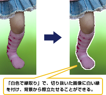 切り抜き画像の輪郭に白く縁取りをつけることができます。効果を大きくすればするほど縁取りの幅が広くなります。 |