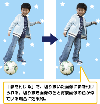 切り抜いた画像に効果を加えることで、自然に見せたり、切り抜き画像を目立たせたりすることができます。 |