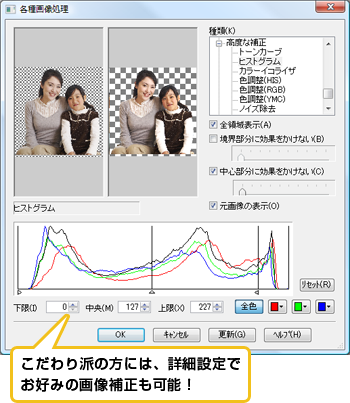| こだわり派の方には詳細に補正や効果を設定する詳細設定を用意しています。 |