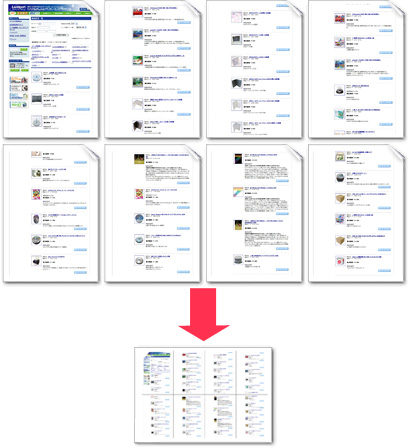 長文のメールやブログ、通販の商品ページなどの長いスクロールで印刷が複数ページにわたる場合は、最大8ページを縮小して1枚の用紙に印刷することができます。大幅に用紙を節約できます。